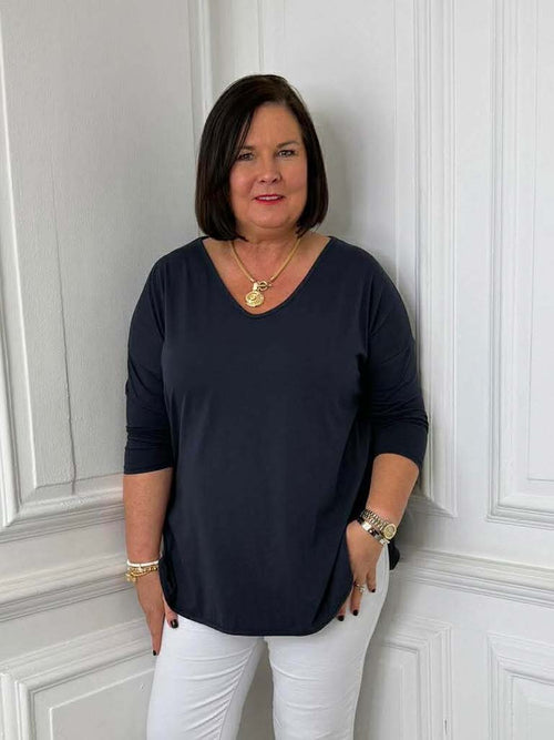 V-Neck Scooped Hem Top - Navy