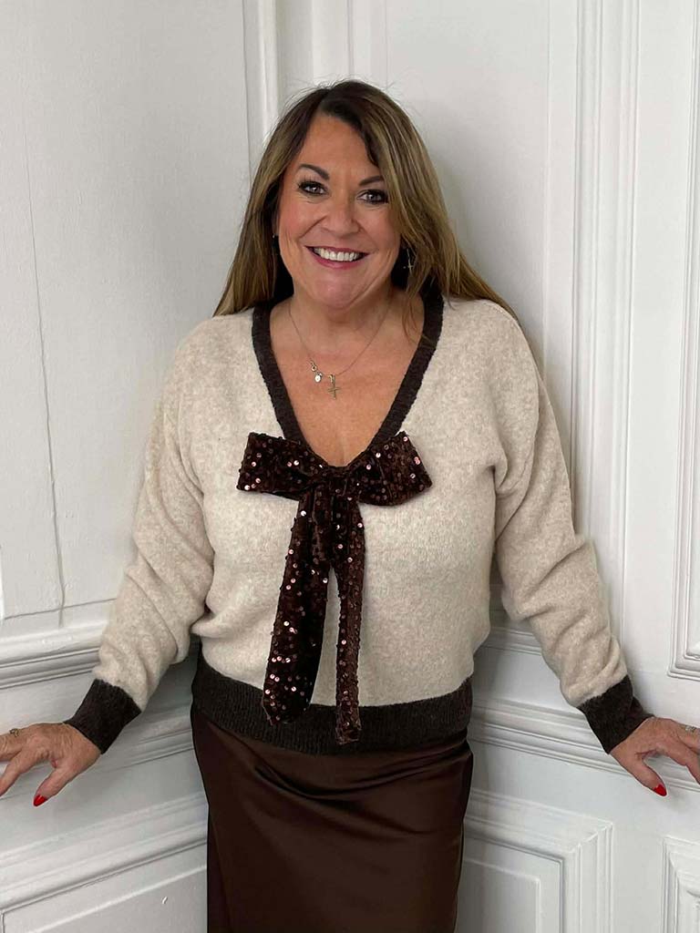 V-Neck Sequin Bow Knit - Stone