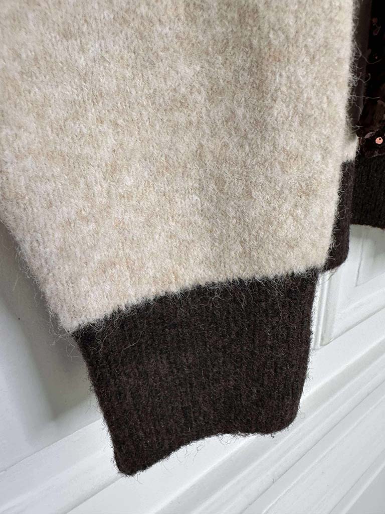 - Chocolate brown neckline, cuffs and hem